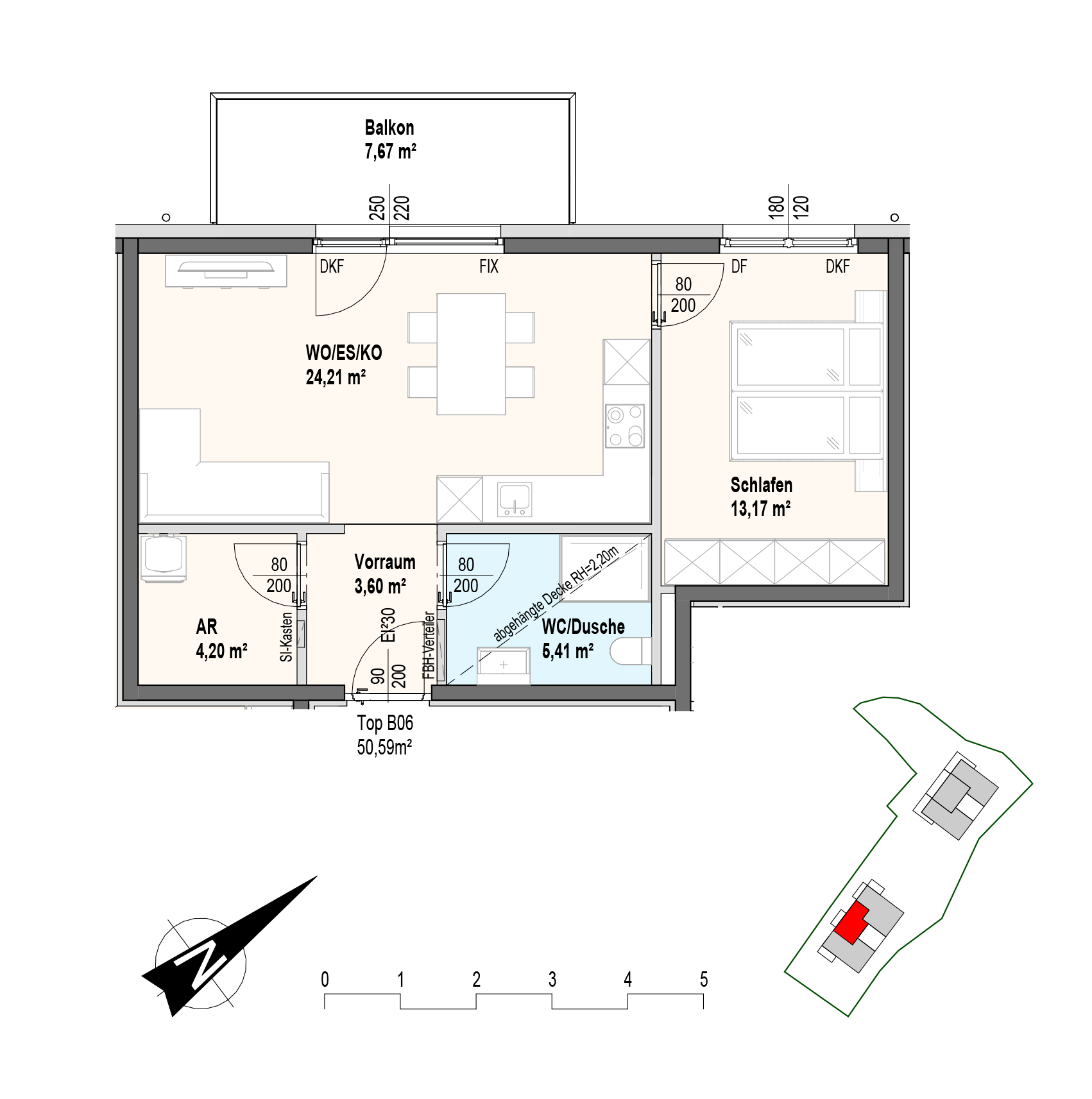 Das Projekt bietet im Erdgeschoss eine 4- und drei 3-Zimmerwohnung mit großzügigen Terrassen und zugeordneten Gartenanteilen. Im Obergeschoß werden fünf 2- und eine 3-Zimmerwohnung mit entsprechenden Balkonen errichtet. Eine weitere 4-Zimmerwohnung sowie eine 3-Zimmerwohnung mit weitläufigen Terrassen entsteht im Dachgeschoss. Im Untergeschoss befinden sich die Tiefgarage, Kellerabteile, Technikräume sowie eine Abstellmöglichkeit für Fahrräder, Kinderwägen, Sportgeräte und Rollstühle. Jede Wohnung hat ein Kellerabteil und einen bzw. zweiAutoabstellplätze in der Tiefgarage. Im Erdgeschoss befinden sich die Besucherparkplätze und ein Spielplatz. Im Bereich der Tiefgarageneinfahrt befindet sich die Müllsammelbox. Die Erschließung der Stockwerke erfolgt barrierefrei über die innenliegenden Stiegenhäuser mit Lift.